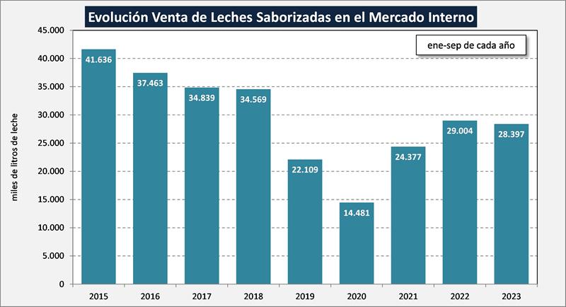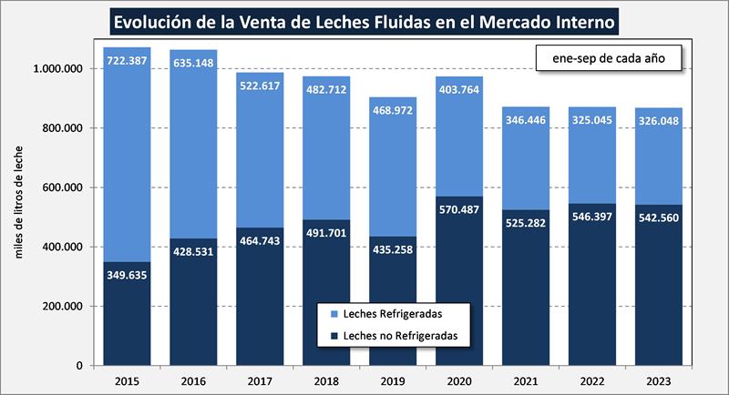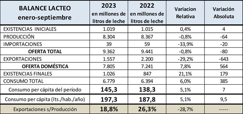 Si hacemos la comparación interanual, en los primeros nueve meses de 2023 respecto a igual período del año anterior, las ventas según datos basados en la resolución mencionada, subieron 0,9% en volumen de productos y 3,8% en litros de leche equivalentes, situación que guarda un correlato con la caída de exportaciones de casi el 30% y un sostenimiento de los stocks iniciales, ya que resulta muy oneroso su mantenimiento.