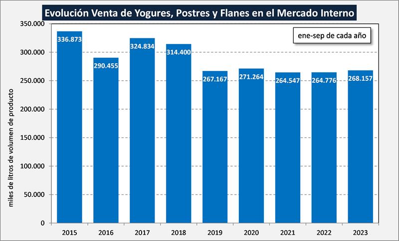 En el gráfico de abajo se ve cómo productos como las leches saborizadas o chocolatadas, que presentaron una muy alta tasa de crecimiento en el año 2022 (19%), y que era sólo por efecto de comparar con un año donde las ventas fueron extremadamente bajas, en 2023 caen levemente y se encuentran muy lejos de los valores de 2015/2018. Situación muy similar presenta el gráfico que le sigue de yogures, postres y flanes.