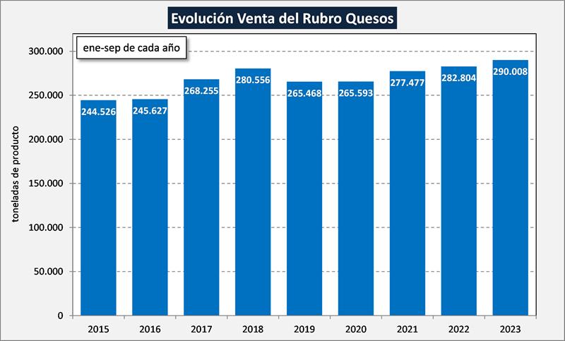 Para los quesos, el principal rubro de destino de elaboración y comercialización de productos, se da una situación de tenue crecimiento donde se prioriza por precio, al peso (fraccionados) y con prevalencia de productos más commodities (cremoso, barra y duros “frescos”) que especialidades.