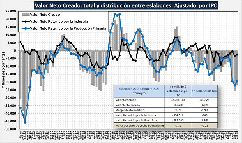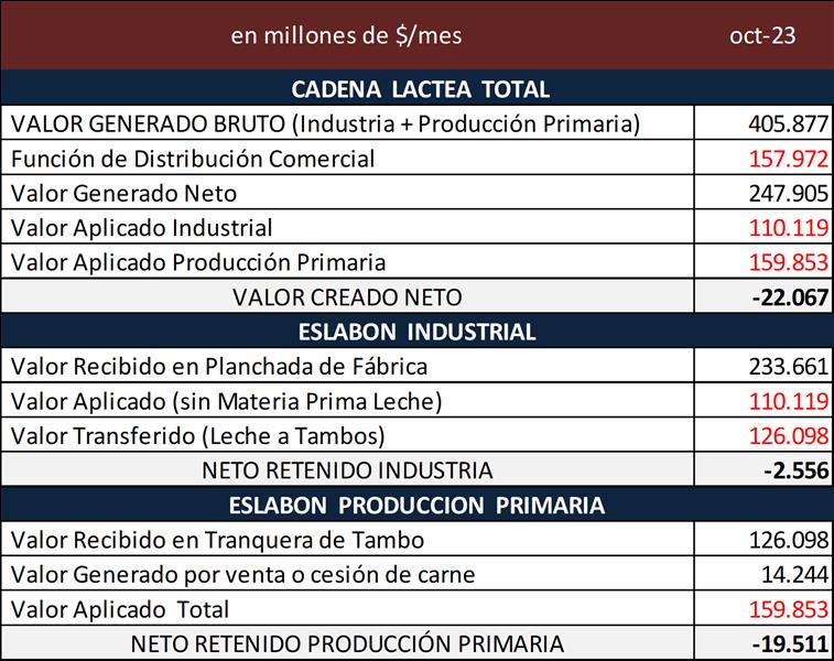 La cadena presenta un resultado negativo en octubre de 2023 de $ 22.067 millones (5,9 centavos de dólar por litro de leche equivalente). El sector industrial tiene un resultado estimado negativo de $ 2.556 millones y quien lleva la mayor pérdida es el sector primario con $ 19.511 millones (unos $ 18,30/litro o US$ 5,2 centavos por litro de leche), lo que indicaría un precio de equilibrio necesario en torno de los $ 150 para cubrir todos los costos operativos y el costo de oportunidad del capital.