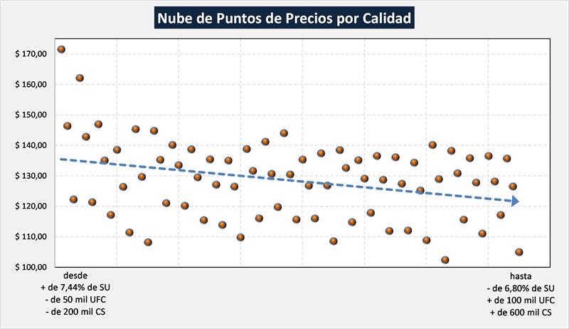Si elaboramos una nube de puntos con los diferentes precios disponibles en función a las calidades, podemos observar que se da una pendiente descendente de precios a medida que es menor la calidad integral de la leche, pero esa pendiente podría ser mucho más pronunciada si se pretende mejorar/incentivar la mejor calidad de leche.