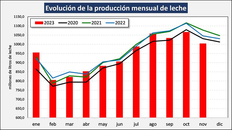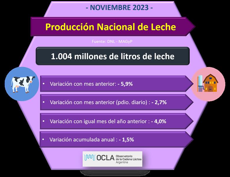 En el mes de noviembre del 2023 la producción fue de 1.004 millones de litros de leche, esto implica un valor 5,9% por debajo del mes anterior (-2,7% en él promedio diario) y un 4,0% menos que igual mes del año anterior.