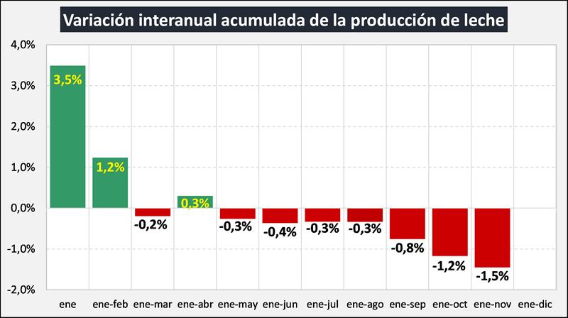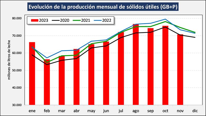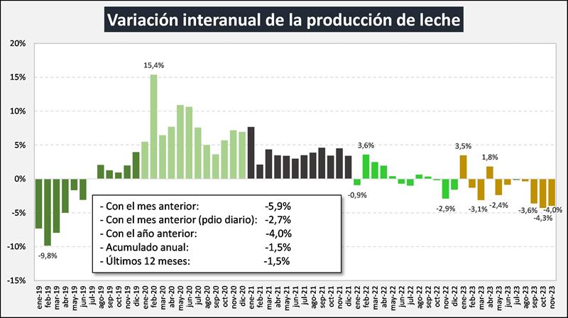 Normalmente la producción en el mes de noviembre decrece entre 1,5 y 2% respecto a octubre (en promedio diario), este año ha tenido una caída del 2,7%, producto de la seca generalizada y prolongada que sufrieron en diferente medida todas las regiones productivas y que redujeron la disponibilidad de pasturas, verdeos y reservas forrajeras y que persiste aún en muchas zonas, y las relaciones desfavorables entre precio de la leche y algunos insumos básicos (sobre todo concentrados). Noviembre 2023 es el mes de menor producción en noviembre de los últimos 4 años.