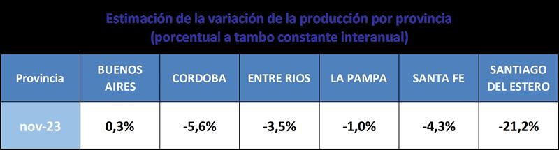 La variación interanual de la producción en noviembre de 2023 fue del -4,0% y el comportamiento por provincia se expresa en el cuadro siguiente: