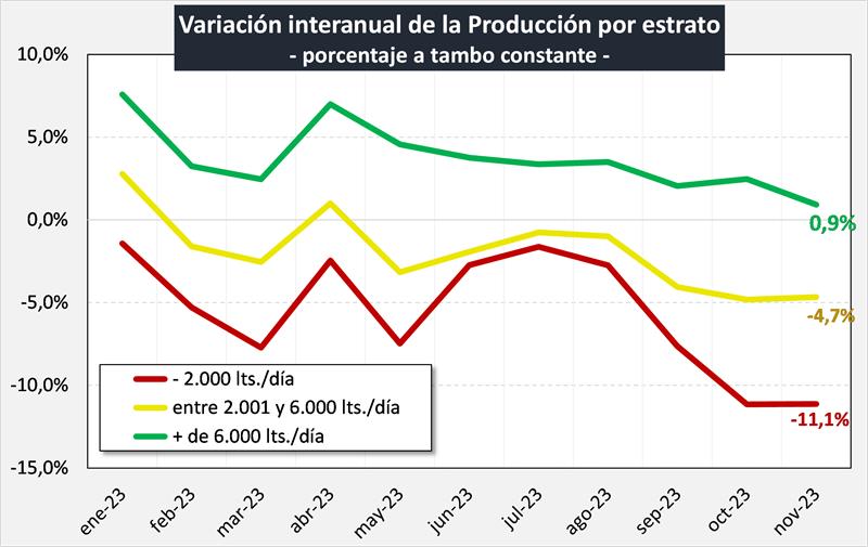 Si analizamos el comportamiento de la producción por estrato productivo, podemos observar que el estrato de más de 6.000 litros diarios de producción, nunca estuvo por debajo del año pasado durante los 11 meses de 2023. Por su parte los estratos más bajos presentan caídas interanuales significativas durante todo el año y fundamentalmente en los últimos meses.