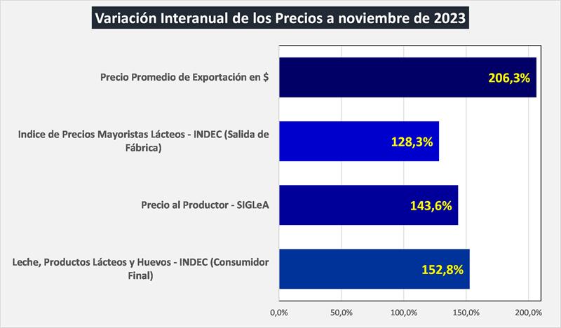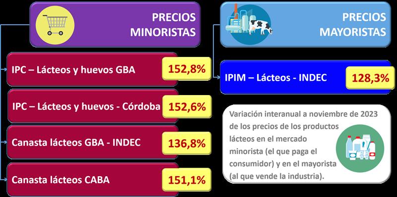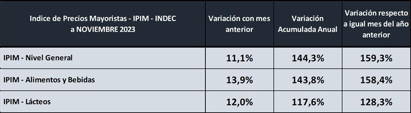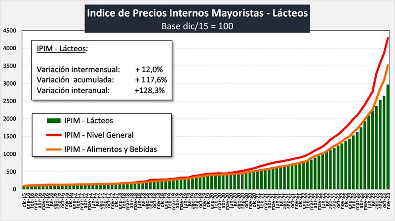 El índice mayorista de precios de los Lácteos registró un aumento de 12,0% en noviembre de 2023 respecto del mes anterior, en los once meses transcurridos de 2023 tuvo un incremento del 117,6% y la comparación anual con noviembre de 2022 arrojó un incremento del 128,3%.