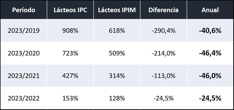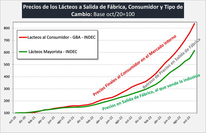 Al comparar el índice minorista de Leche, Productos Lácteos y huevos (+142,6% interanual) con los Precios Mayoristas de los Lácteos, se observa una brecha en detrimento de los precios en salida de fábrica de casi 30 puntos porcentuales. Si comparamos los precios de los lácteos del índice de precios minoristas (con datos de GBA y CABA, y ponderación OCLA ya que no hay un índice lácteo minorista nacional), que presentaron a octubre de 2023 una suba interanual del 130%, vemos que los precios mayoristas de los lácteos están 16 puntos porcentuales por debajo.
