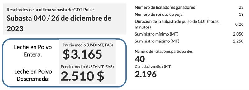 La Subasta Nº 040 se ha llevado ha cabo en el día de ayer, martes 26 de diciembre, donde el precio promedio obtenido para la LPE ha sido de 3.165 US$/t, lo que representa una suba de 1,8% respecto a lo publicado en la última GDT pulse (3.109 US$/t) y es un precio menor (-1,3%) respecto al último evento del GDT (3.207 US$/t).