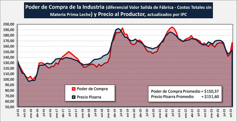 El poder de compra que se determina es el resultante de deducir del valor de salida de fábrica el total de costos sin considerar la materia prima leche y sin ningún nivel de resultado empresarial por encima de un costo de oportunidad que se calcula de igual manera para la industria como para el sector primario. Por lo tanto, el Valor de Referencia o Poder de Compra no significa Precio al Productor, en algunos momentos el Precio al Productor supera el Poder de Compra por circunstancias del mercado y en otras ocurre a la inversa, obviamente produciéndose resultados negativos o positivos, respectivamente para la industria.