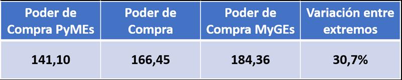 Los valores de poder de compra o valor de referencia de demanda son promedios de cada categoría de empresas y luego surge un promedio general. Aquí surgen grandes diferencias entre empresas respecto a qué tipo de productos elaboran y comercializan, que mercados atienden, que nivel de marca tiene por ejemplo en el mercado interno, o cuestiones vinculadas con la escala, la productividad y la eficiencia.