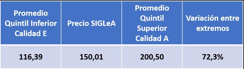 También observando la grilla de precios de SIGLeA, los tambos que están en el 20% superior de la Categoría de Calidad A lograron precios de $ 200,50/litro o más y los del 20% inferior de la Categoría de Calidad E tuvieron un precio de $ 116,39/litro o menos, generando un diferencial del 72,3% entre extremos.