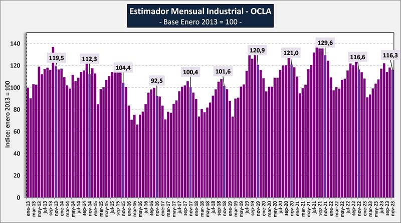 El EMI-OCLA ascendió a 116,3 en noviembre de 2023, valor 1,7% inferior al mes anterior (+1,6% en el promedio diario), bajó el 0,2% respecto a igual mes del año anterior y el acumulado del período enero-noviembre de 2023 es 2,4% inferior a igual período del año anterior.
