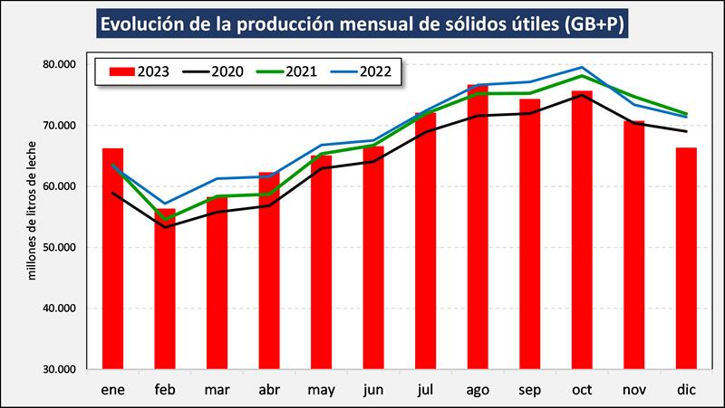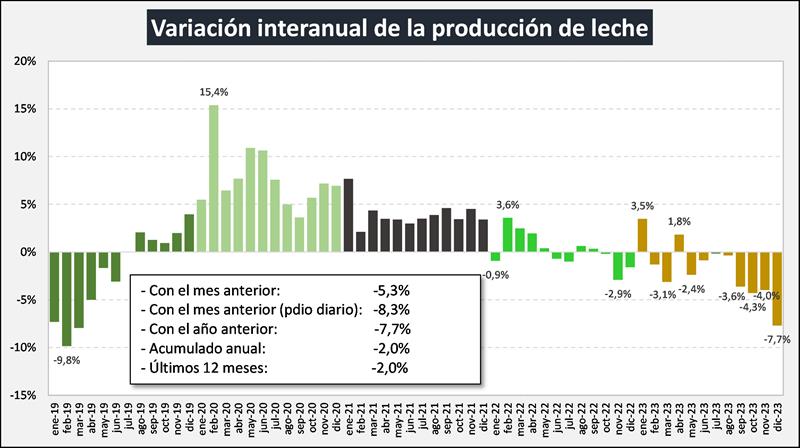 Normalmente la producción en el mes de diciembre decrece entre 5 y 6% respecto a noviembre (en promedio diario), este año ha tenido una caída del 8,3%, producto de algunos efectos colaterales de la seca generalizada y prolongada que sufrieron en diferente medida todas las regiones productivas, luego exceso de lluvia en otras durante el mes y las relaciones desfavorables entre precio de la leche y algunos insumos básicos (sobre todo concentrados), sumado todo la anterior a los incrementos de costos por la devaluación y la alta inflación. Diciembre 2023 es el mes de menor producción en diciembre de los últimos 4 años.