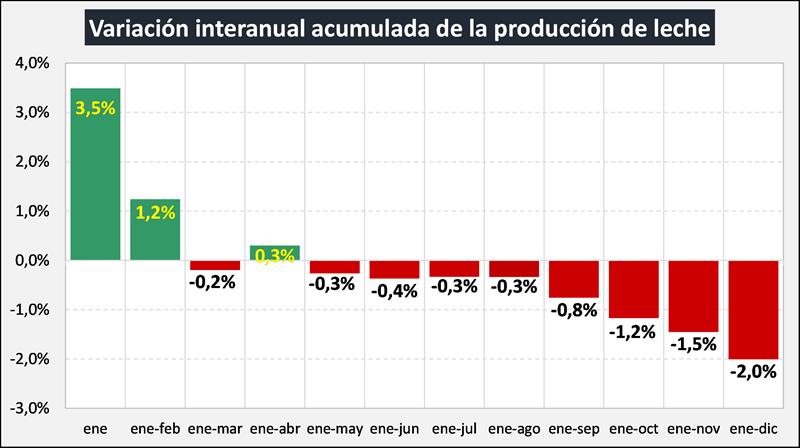 La producción del año 2023 alcanzó los 11.325,6 millones de litros de leche lo que significa una caída del 2,0% respecto al año 2022 (11.557,4 millones de litros).