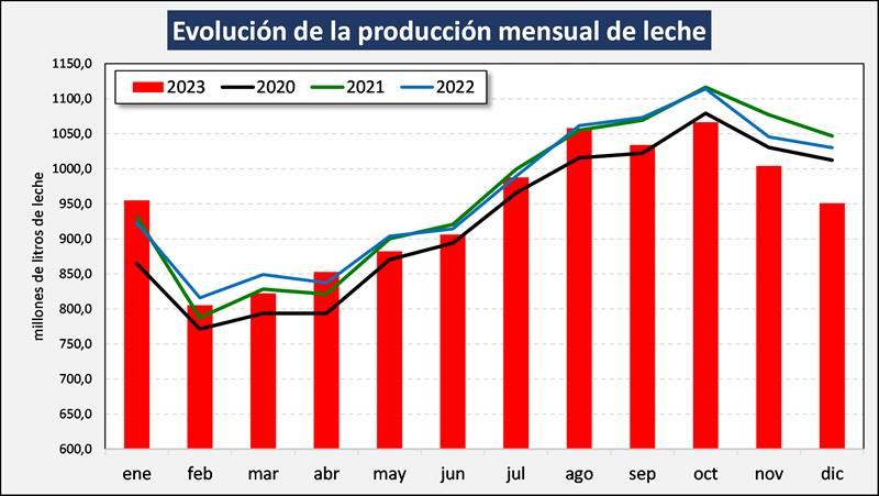 En el mes de diciembre del 2023 la producción fue de 951,2 millones de litros de leche, esto implica un valor 5,3% por debajo del mes anterior (-8,3% en él promedio diario) y un 7,7% menos que igual mes del año anterior.