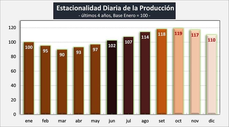 Como es habitual, la producción desde el pico de máxima en octubre, cae a una tasa del 5% mensual hasta marzo/abril (tomando el promedio diario de producción, para que no afecten la cantidad de días de cada mes), donde luego comienza un nuevo repunte hacia octubre.