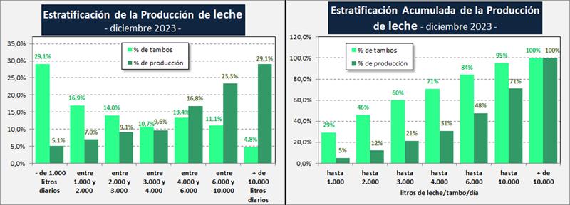 Entre 2023 y 2010 los tambos de menos de 2.000 litros de producción diaria redujeron a más de la mitad su importancia relativa en la producción de leche total y los tambos de más de 10.000 litros diarios de producción, multiplican por 5 su participación en la producción. Cabe acotar que la reducción de la participación en cantidad de tambos del estrato superior en diciembre de 2023, se debe a que cayó interanualmente la producción total un 7,7% y muchos tambos que estaban levemente por encima del límite de 10.000 litros diarios, pasaron al estrato inmediato anterior.