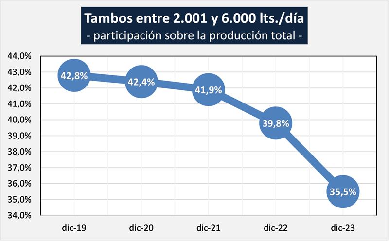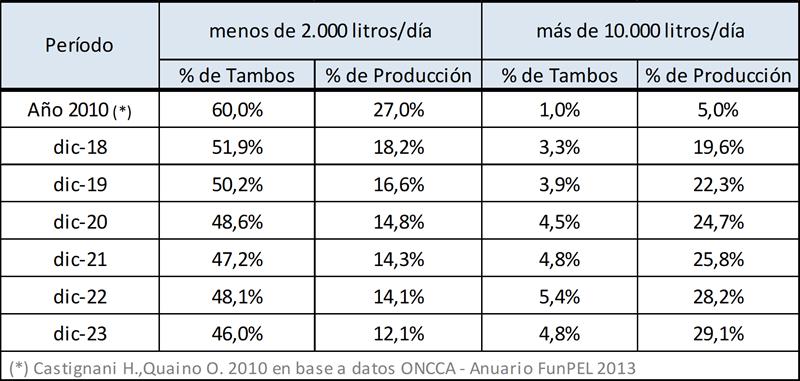 Puede verse en el cuadro siguiente al comparar con datos disponibles del año 2010, que en un extremo disminuye la participación tanto en cantidad de tambos como en el volumen de producción de las unidades productivas de menos de 2.000 litros diarios y en el otro extremo de la estratificación, se incrementa la participación de las unidades de más de 10.000 litros diarios.