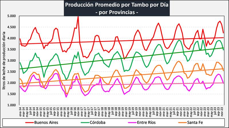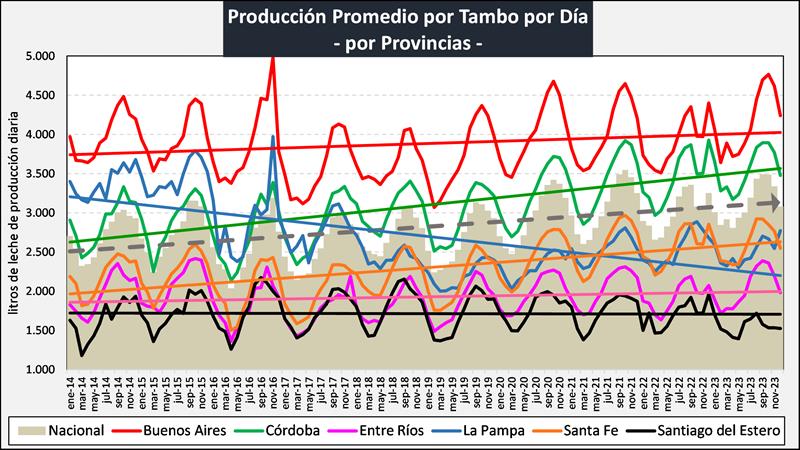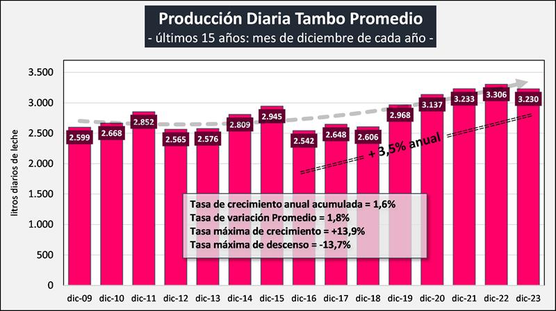 Sobre la base de la producción mensual y la cantidad anual de tambos (SENASA), podemos inferir el tamaño del tambo promedio, unos 3.230 litros de leche diarios para diciembre de 2023, una producción inferior al año anterior (-2,3%). Si evaluamos su comportamiento en el tiempo, a pesar de la disminución en el número de unidades productivas y en el número de vacas, el tambo promedio presenta en el período 2009-2023 una tasa de crecimiento acumulada anual del 1,6%, lo que permite el sostenimiento e incluso aumento de los niveles productivos agregados a nivel país.