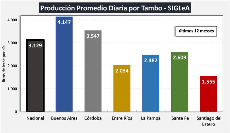 La producción promedio diaria por tambo y por provincia que graficamos aquí es la que arrojan los datos de SIGLeA – LUME y se toma el promedio de los últimos 12 meses (enero/23 – diciembre/23). Los datos SIGLeA – LUME del último mes provienen de 7.722 liquidaciones, 367 industrias lácteas.