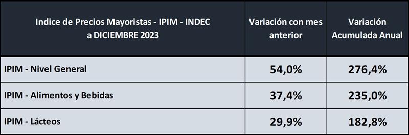Índice de Precios Internos Mayoristas – IPIM – Lácteos – diciembre 2023 17/1/2024
