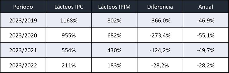 Al comparar el índice minorista de Leche, Productos Lácteos y huevos (+210,9% interanual) con los Precios Mayoristas de los Lácteos, se observa una brecha en detrimento de los precios en salida de fábrica de casi 30 puntos porcentuales. Si comparamos los precios de los lácteos del índice de precios minoristas (con datos de GBA y CABA, y ponderación OCLA ya que no hay un índice lácteo minorista nacional), que presentaron a diciembre de 2023 una suba interanual del 200%, vemos que los precios mayoristas de los lácteos están 17 puntos porcentuales por debajo.