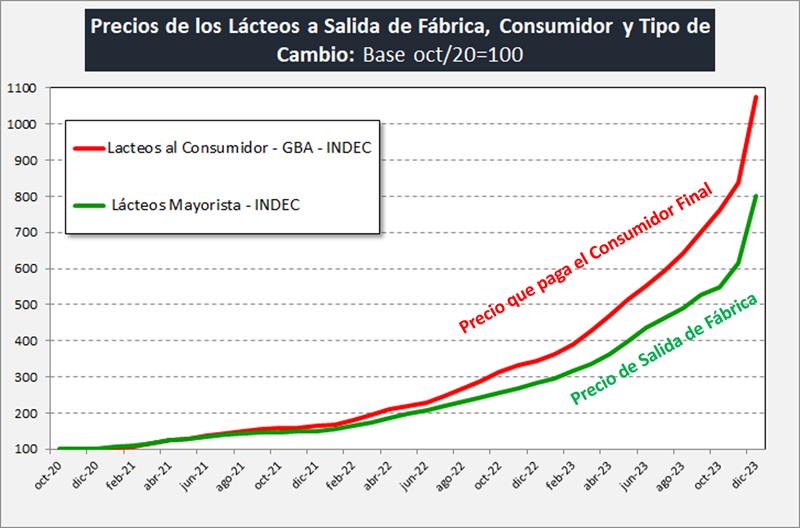El índice mayorista de precios de los Lácteos registró un aumento de 29,9% en diciembre de 2023 respecto del mes anterior, y la comparación anual con diciembre de 2022 arrojó un incremento del 182,8%.