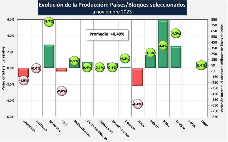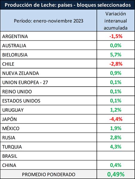 En el cuadro siguiente se toma un grupo seleccionado de los principales países que representan alrededor del 55% de la producción mundial de leche de vaca, en el cual se puede observar un incremento de la producción del 0,49%, para el período enero-noviembre de 2023 respecto a igual período del año pasado.