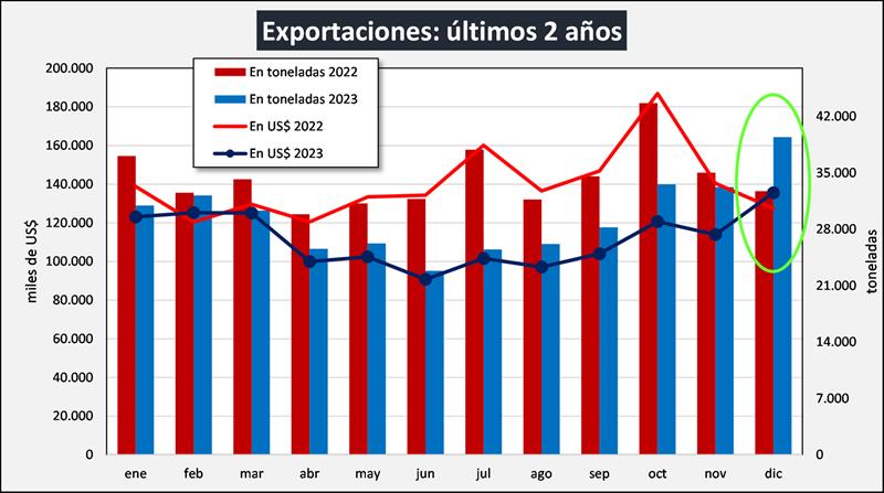 La variación intermensual de las exportaciones fue de +18,7% en volumen y de +19,0% en valor (dic/23 vs. nov/23). La variación interanual fue de +20,5% en volumen y +6,4% en valor (dic/23 vs. dic/22).