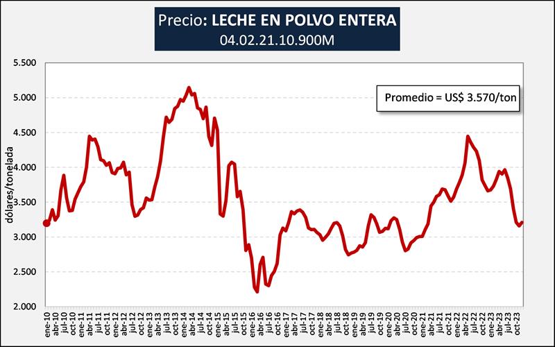 El precio medio de exportación por tonelada fue de US$ 3.780 para el año 2023, lo que implicó una caída del 7,0% respecto al año 2022. En el caso particular del rubro Leches en Polvo, el precio promedio fue de US$ 3.639/ton., un 7,6% por debajo del año anterior. Por otra parte, el precio promedio de exportación logrado en diciembre de 2023 medido en pesos, fue 310% superior al precio promedio logrado en diciembre de 2022, como referencia en igual período el IPC Lácteos creció 210,9%, el IPIM Lácteos el 182,8, el dólar mayorista el 271,3% y el precio SIGLeA el 192,3%.