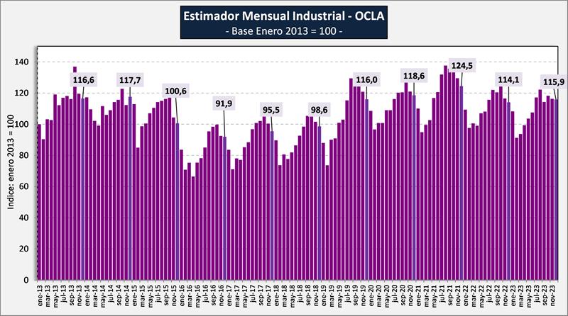 El EMI-OCLA ascendió a 115,9 en diciembre de 2023, valor 0,4% inferior al mes anterior (-3,6% en el promedio diario), subió el 1,5% respecto a igual mes del año anterior y el acumulado del año 2023 fue -2,1% inferior al año 2022, muy en línea con la caída de producción (-2,0%), con lo cual los precios se mantuvieron en moneda constante casi iguales que 2022.