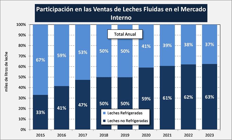 En los dos gráficos siguientes se presentan las ventas (en miles de litros), del año 2023 de leches fluidas (refrigeradas y no refrigeradas), donde se puede ver por un lado el descenso en el total de leches fluidas (al menos las que captura la Resolución 230) que se viene dando en los últimos 7 años. Por otra parte, en el gráfico que le sigue a éste, se evidencia claramente cómo van creciendo en participación las leches no refrigeradas en detrimento de las leches refrigeradas.