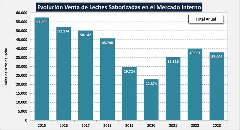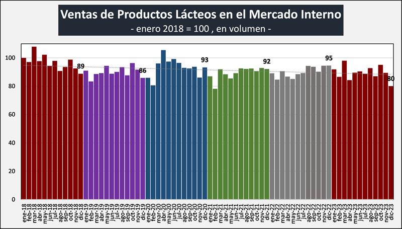 Si hacemos la comparación interanual, entre el año 2023 respecto del año anterior, las ventas según datos basados en la resolución mencionada, bajaron 0,7% en volumen de productos y subieron 2,4% en litros de leche equivalentes, situación que guarda un correlato con la caída de exportaciones de más del 20% y un cuasi sostenimiento de los stocks iniciales, ya que resulta muy oneroso su mantenimiento.