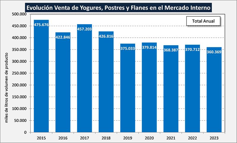 En el gráfico de abajo se ve cómo productos como las leches saborizadas o chocolatadas, que presentaron una muy alta tasa de crecimiento en el año 2022 (13%), y que era sólo por efecto de comparar con un año donde las ventas fueron extremadamente bajas, en 2023 caen 5% y se encuentran muy lejos de los valores de 2015/2018. Situación muy similar presenta el gráfico que le sigue de yogures, postres y flanes.