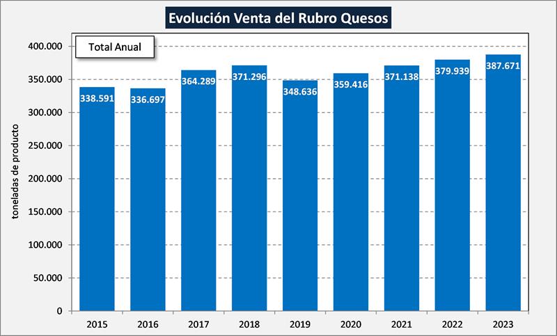 Para los quesos, el principal rubro de destino de elaboración y comercialización de productos, se da una situación de tenue crecimiento donde se prioriza por precio, al peso (fraccionados) y con prevalencia de productos más commodities (cremoso, barra y duros “frescos”) que especialidades.