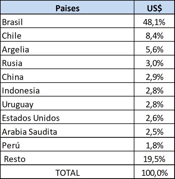 El destino de las exportaciones (en función al monto en dólares) se conformó: