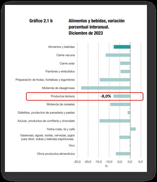 La elaboración de productos lácteos registra en diciembre una caída interanual de 8,0%. En el mes de referencia se refleja una menor elaboración de leches en polvo, yogures, leches fluidas y quesos. Según fuentes consultadas, la menor actividad del sector responde a una disminución en la demanda interna. En este sentido, según datos de la Dirección Nacional de Lechería, la producción primaria de leche –materia prima de la industria láctea– presenta una disminución interanual de 7,7% en el mes bajo análisis.