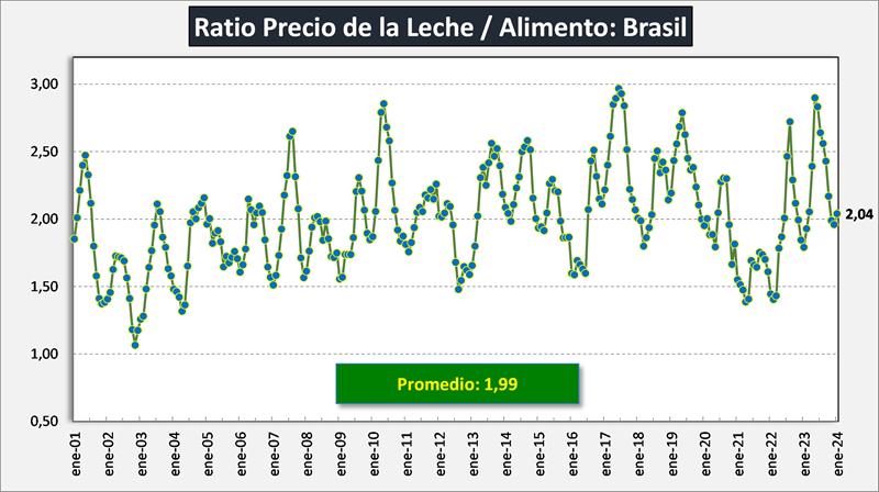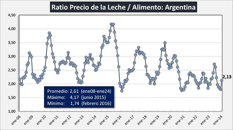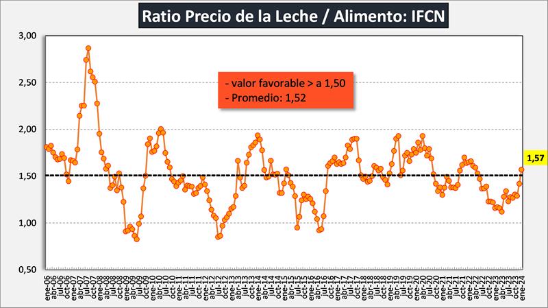 Este ratio es suministrado por MilkPoint: Precio de la Leche al Productor / Gasto de Alimentación.