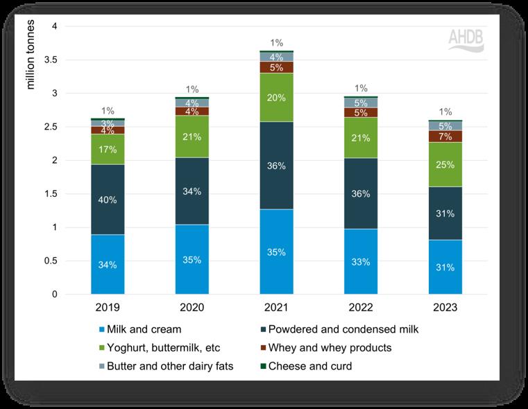 En cuanto a los productos de estos importadores clave, el 90% del producto estadounidense importado en 2023 fue suero o productos de suero. Mientras tanto, las importaciones del Reino Unido a China se realizaron con un 72% de leche y nata en 2023, lo que equivale a 16.000 toneladas.