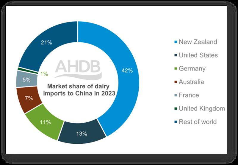 Nueva Zelanda sigue siendo el mayor exportador de productos lácteos a China, con una cuota de mercado del 42% en 2023. Poco menos de la mitad (49%) de este volumen se compone de polvos, y la leche y la nata representarán otro 30% en 2023. Otros importadores clave son Estados Unidos, Alemania y Australia, mientras que el Reino Unido tiene una cuota de mercado justo por debajo del 1% en las importaciones de lácteos chinos.