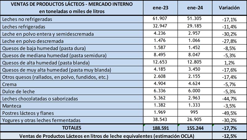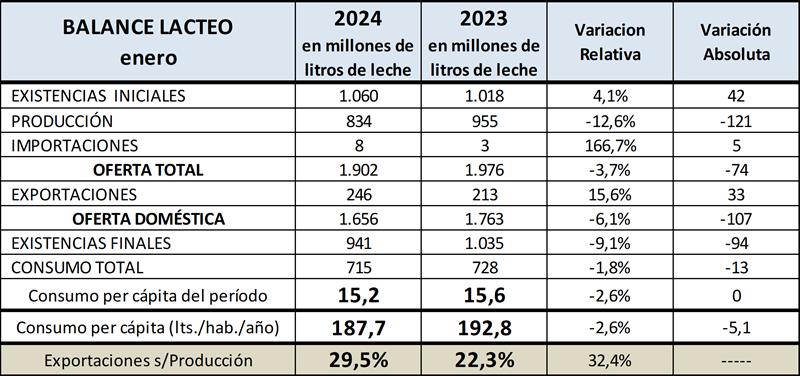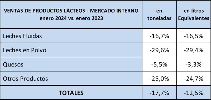 La comparación interanual (ene/24 vs ene/23) indicó una disminución en volumen del 17,7% y del 12,5% en litros de leche equivalentes.