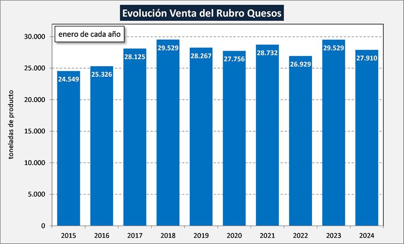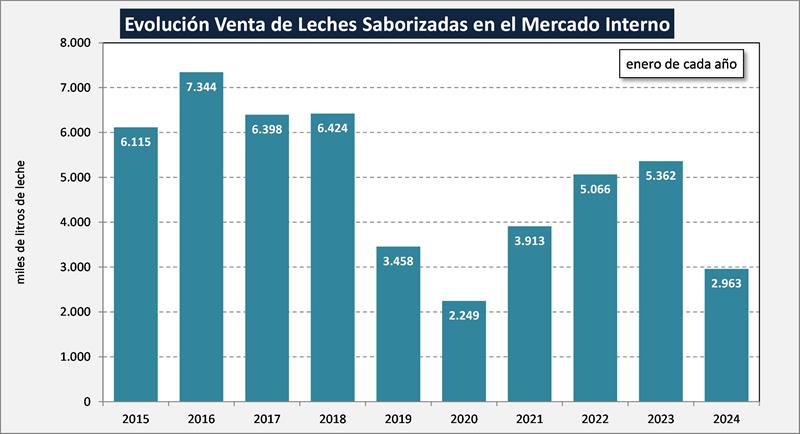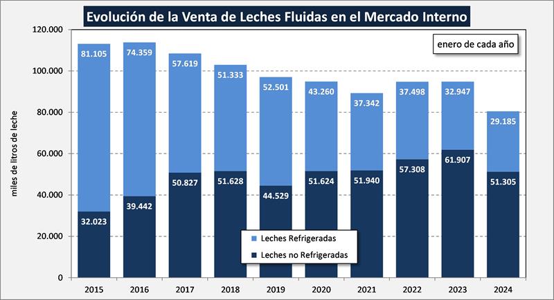 Las ventas según la Resolución 230/16 de la DNL presentaron para el mes de enero de 2024 un volumen 5,5% inferior y cayeron un 4,6% en litros de leche equivalentes respecto al mes anterior, algo por encima de la caída estacional.