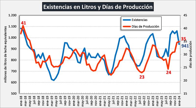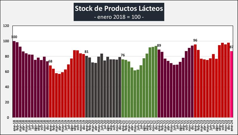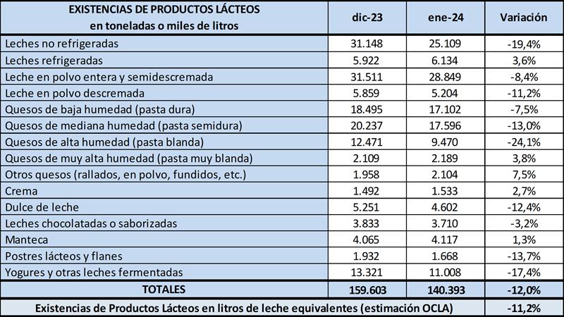 En el mes de enero de 2024 las existencias fueron 12,0% inferiores al mes anterior y en litros de leche equivalentes estuvieron 11,2% por debajo del mes anterior.