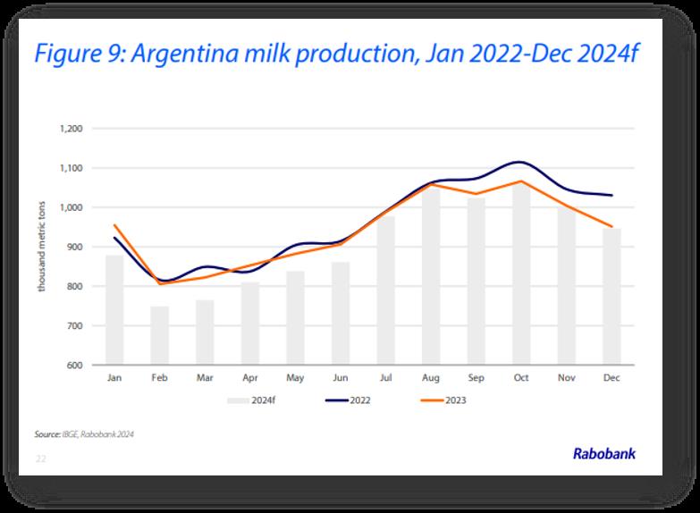 La producción de leche de Argentina terminó 2023 alrededor de un 2% menos que en 2022. Las caídas en la producción de leche se están acelerando a principios de 2024, y la producción probablemente será un 8% menor interanual en el primer trimestre de 2024.