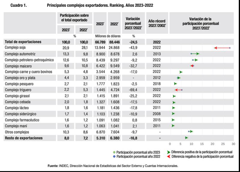 Los complejos exportadores representaron el 92,0% de las ventas totales al exterior durante el 2023. En particular, los complejos soja, automotriz, petrolero-petroquímico, maicero, carne y cuero bovinos, oro y plata, cebada, pesquero, triguero y girasol, concentraron el 75,1% del total de las exportaciones.