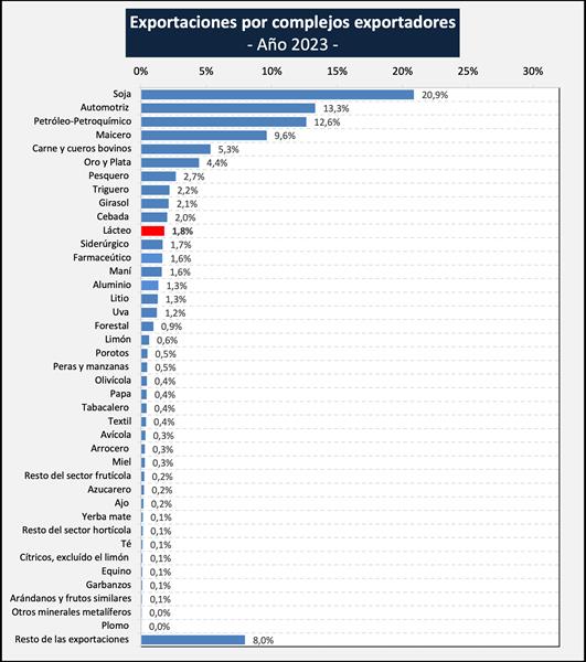 Las exportaciones del complejo lácteo en el período analizado fueron de 1.181 millones de dólares (1,8% del total) y disminuyeron 17,8% respecto al 2022. Las exportaciones de igual período del año pasado habían sido de 1.436 millones de dólares y representaban el 1,6% de las exportaciones totales. Si se incluyen los valores exportados en el rubro "confidenciales - bajo Secreto Estadístico", las exportaciones asciende a 1.337,5 millones de US$ con lo cual la lechería se ubico en 2023 en el puesto N° 10.