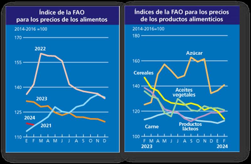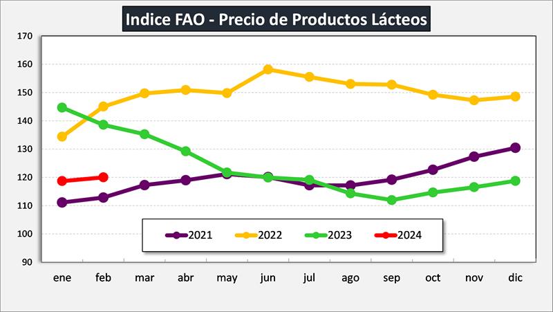 El índice de precios de los productos lácteos de la FAO registró en febrero un promedio de 120,0 puntos, esto es, 1,3 puntos (un 1,1 %) más que en enero, pero se mantuvo 18,6 puntos (un 13,4 %) por debajo del valor registrado en el mismo mes del año pasado. En febrero, los precios mundiales de la manteca fueron los que más subieron, gracias a la mayor demanda de importaciones por parte de los países compradores asiáticos y el descenso estacional de la producción de leche en Oceanía. Por su parte, los precios de la leche entera en polvo siguieron subiendo, aunque lentamente, debido sobre todo al aumento de la demanda de importaciones, especialmente de China, que se vio compensado parcialmente por la caída de los precios en la UE. Los precios de la leche en oolvo descremada se mantuvieron estables, ya que la disminución de los precios en la UE prácticamente contrarrestó el aumento de los precios en Oceanía, fundamentalmente a causa de la menor demanda de importaciones de la región como consecuencia del aumento de los costos de envío y las demoras en el transporte derivados del conflicto en el Mar Rojo. Los precios internacionales del queso también aumentaron ligeramente, ya que el interés de compra por parte de Asia volvió a ser positivo ante la disminución de las existencias en la UE.