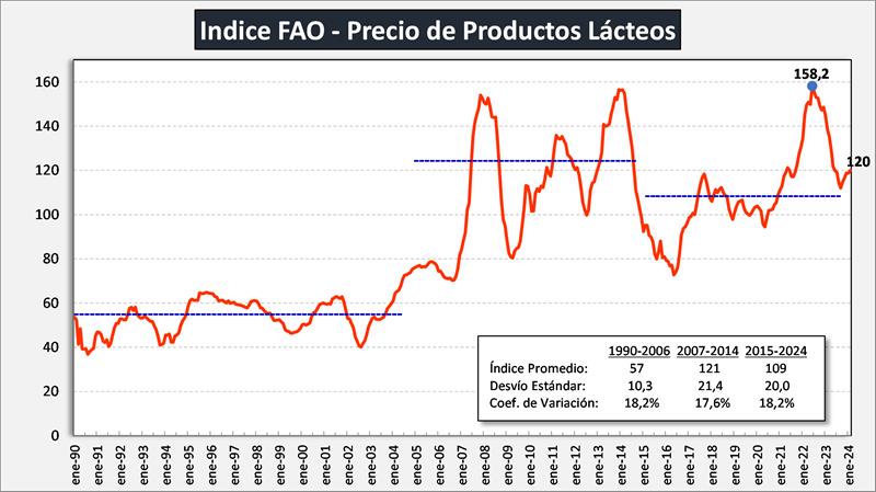 Por su parte el gráfico siguiente muestra el valor promedio de enero-febrero de cada año del índice de precios de los lácteos de FAO de los últimos 25 años (2000-2024):