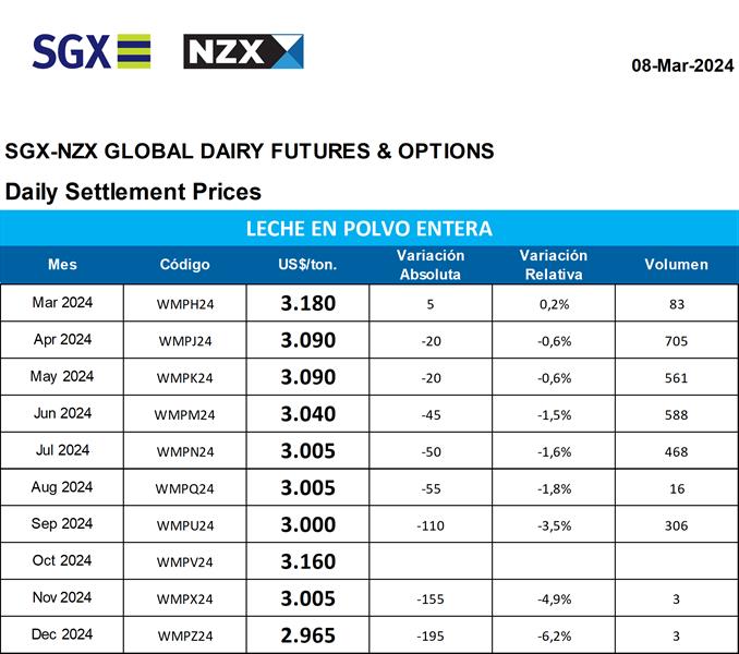 Mercado de Futuros NZX – Leche en Polvo Entera 10/3/2024