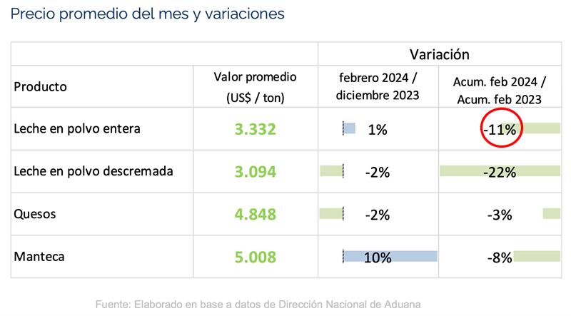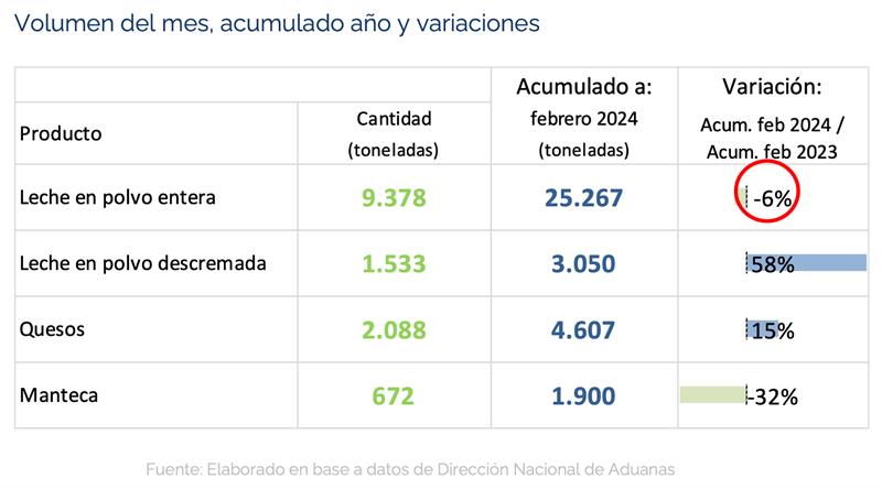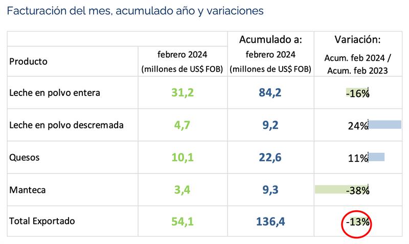 URUGUAY: exportaciones de lácteos - febrero 2024